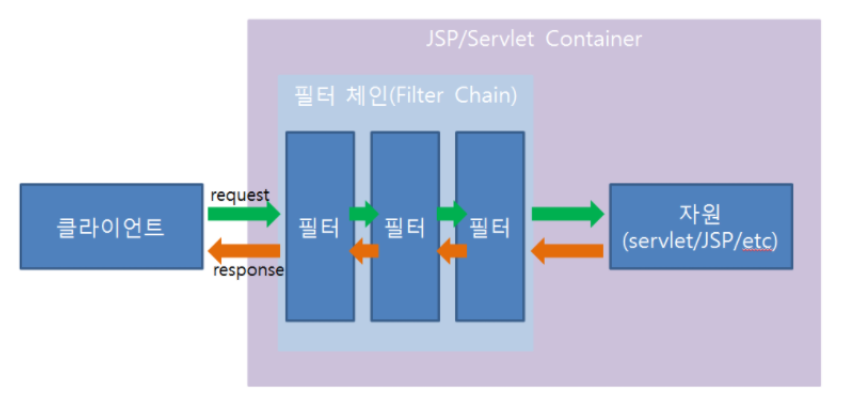 필터는 객체의 형태로 존재하며 클라이언트로부터 오는 요청과 최종 자원(JPS, 서블릿, 기타 자원) 사이에 위치하며 클라이언트의 요청 정보를 변경할 수 있다.