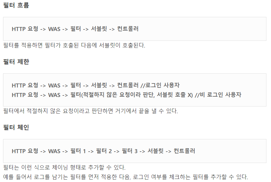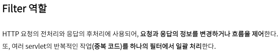 필터란 HTTP 요청과 응답을 변경할 수 있는 재사용 가능한 코드이다.