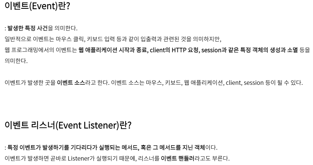 리스너란 특정 이벤트가 발생하기를 ‘귀 기울여’ 기다리다가 실행되는 메서드나 함수, 혹은 그 메서드를 지닌 객체를 가리킨다. 생소한 개념일 수도 있는 이벤트는 이 맥락에서는 발생한 특정 사건을 뜻한다. 마우스 클릭, 키보드 입력, 클라이언트로부터의 HTTP 요청, 웹 애플리케이션 시작, 종료 등이 그 예이다.